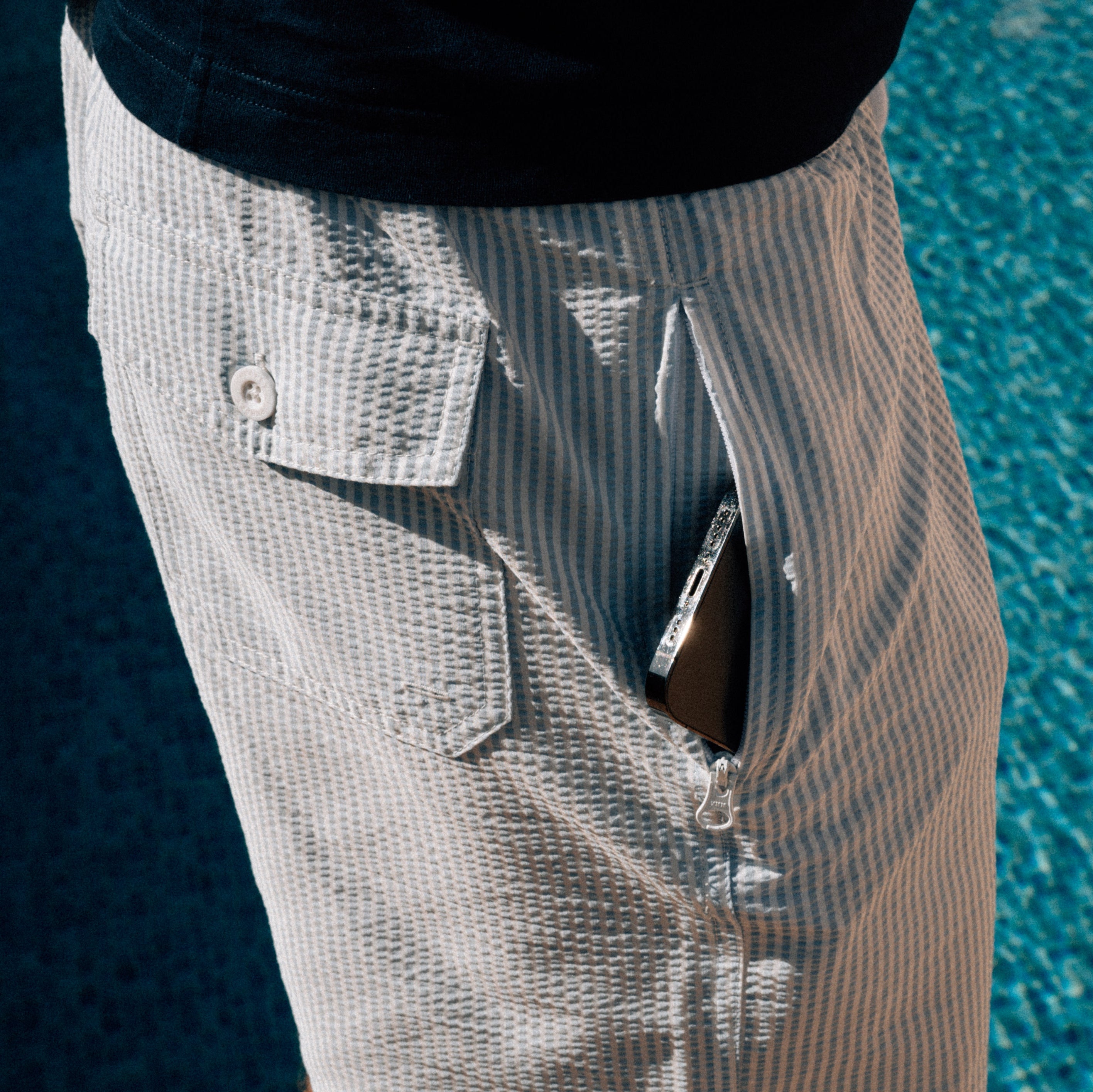 Beide Seitentaschen sind mit unsichtbaren YKK-Reißverschlüssen ausgestattet. Sie sind korrosionsfrei und gegen Chlor- sowie Salzwasser geschützt – so bleiben Wertsachen immer zuverlässig gesichert.